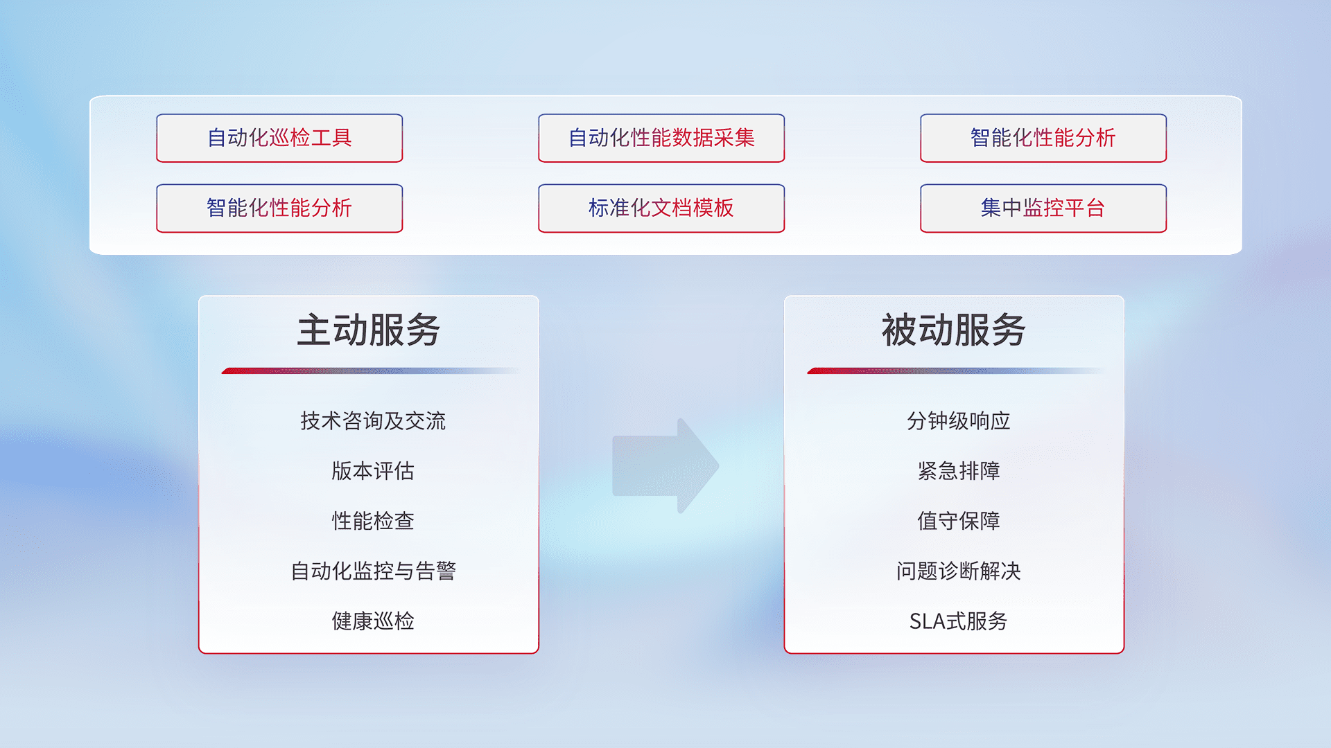 智能化工具和标准化文档,,,保障服务质量,,提供主动服务(包含技术咨询、、版本评估、、、、性能检查、、、自动化监控与告警、、健康巡检)和被动服务包含(分钟级响应、、紧急排障、、值守保障、、、问题诊断解决、、、SLA服务)。。。。